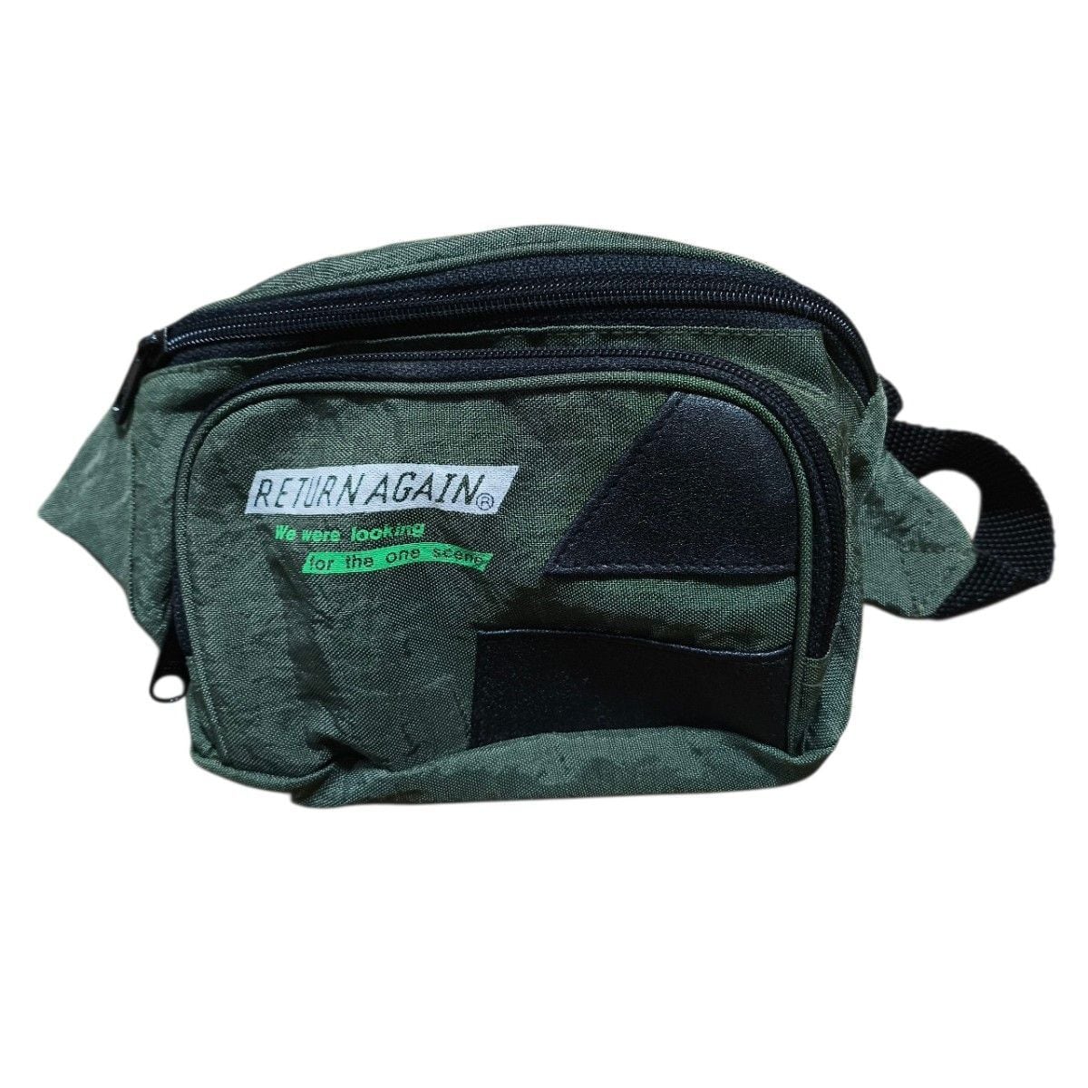 ダークグリーンのRETURN AGAIN製ミニウエストポーチ、ジッパー付きポケットと調整可能なストラップが特徴。