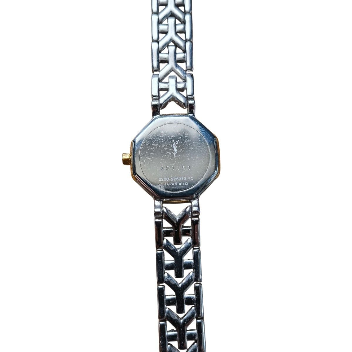 八角形ケースとリンクブレスレットの洗練されたイブ・サンローランのデザインのアナログ腕時計。