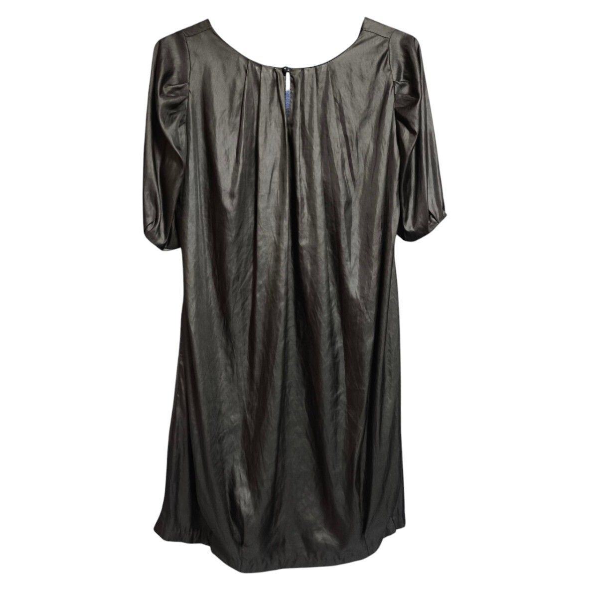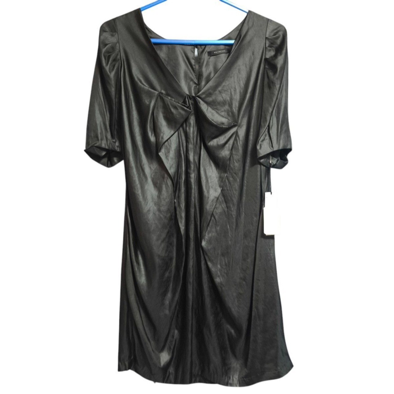 リボン付きのVネックデザインの黒い半袖ワンピース、サイズM。