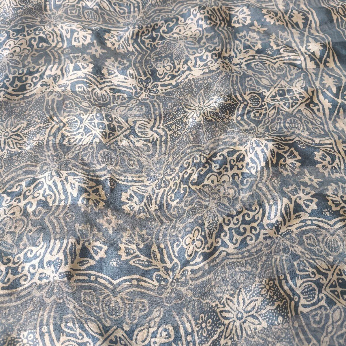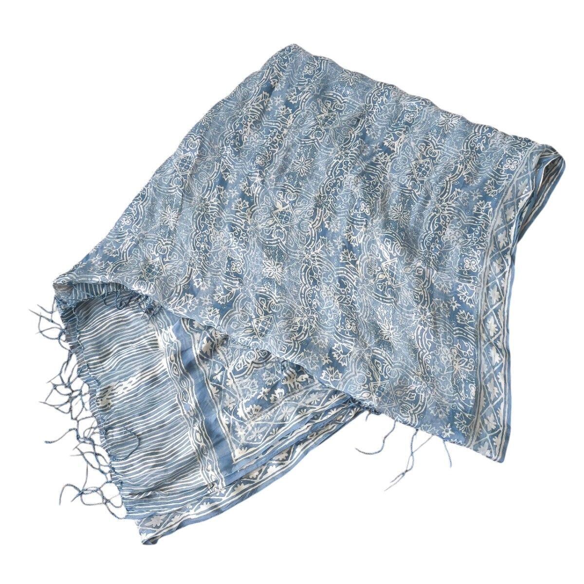 青系の模様が特徴的なストール、サイズ大判で多用途に使用可能。